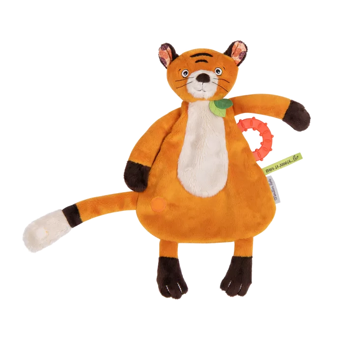 Le Doudou attache-tétine Tigre Tiho de Moulin Roty est un compagnon doux et pratique pour bébé, avec attache-tétine et anneau de dentition intégrés.