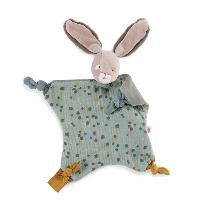 Le Doudou Lapin Sauge de Moulin Roty est un doudou plat en forme de lapin, doté d'une attache-tétine et de grandes oreilles douces, idéal pour les câlins et facile à saisir par les petites mains.