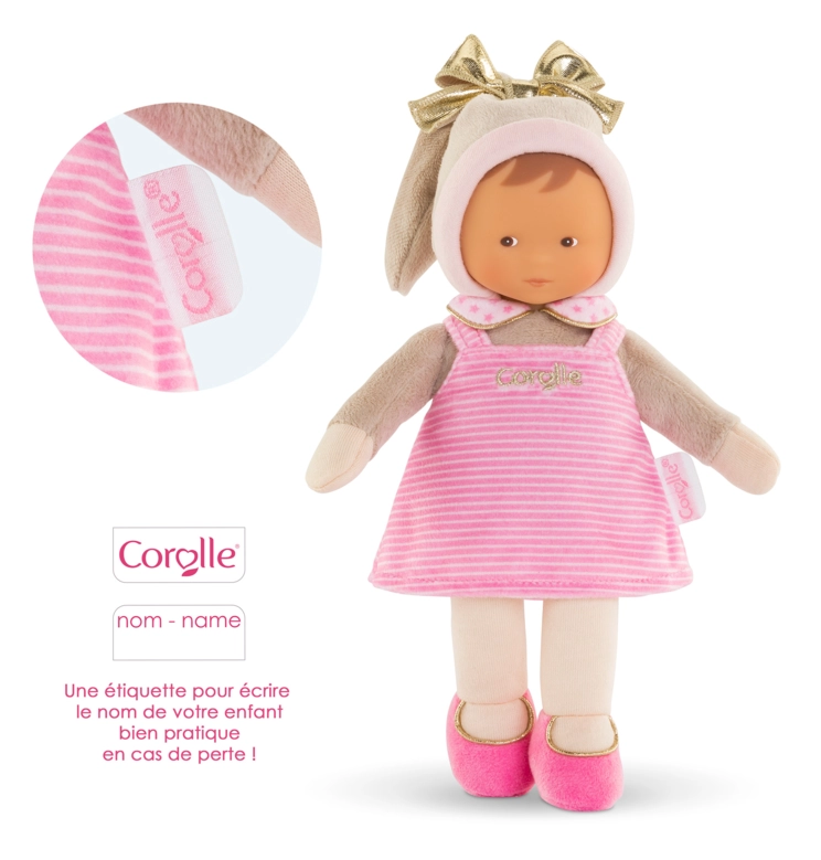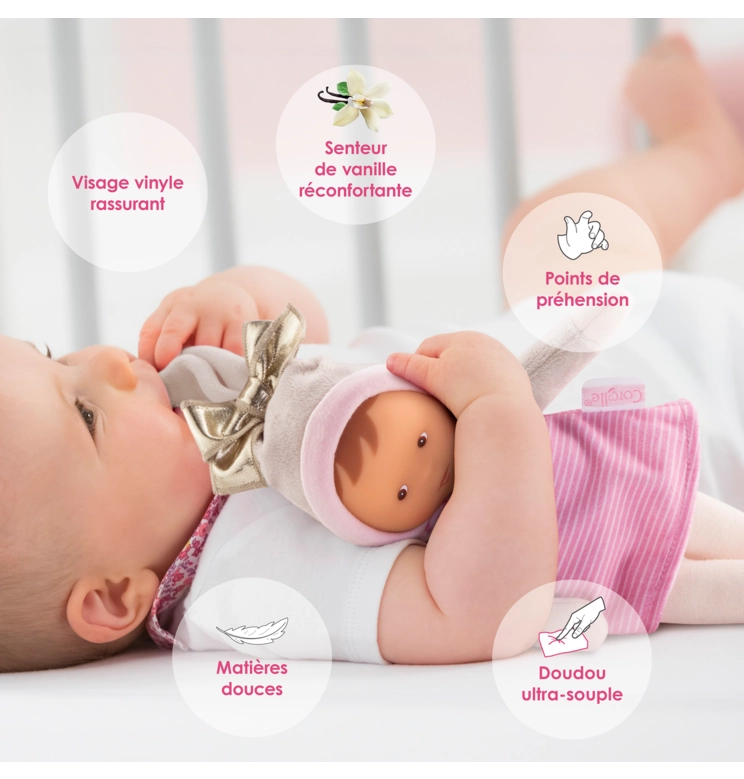 Le Doudou Miss Rayée Rêves d'Étoiles de Corolle est un compagnon doux et rassurant pour votre bébé dès la naissance, avec son visage en vinyle, sa senteur de vanille et son design charmant.