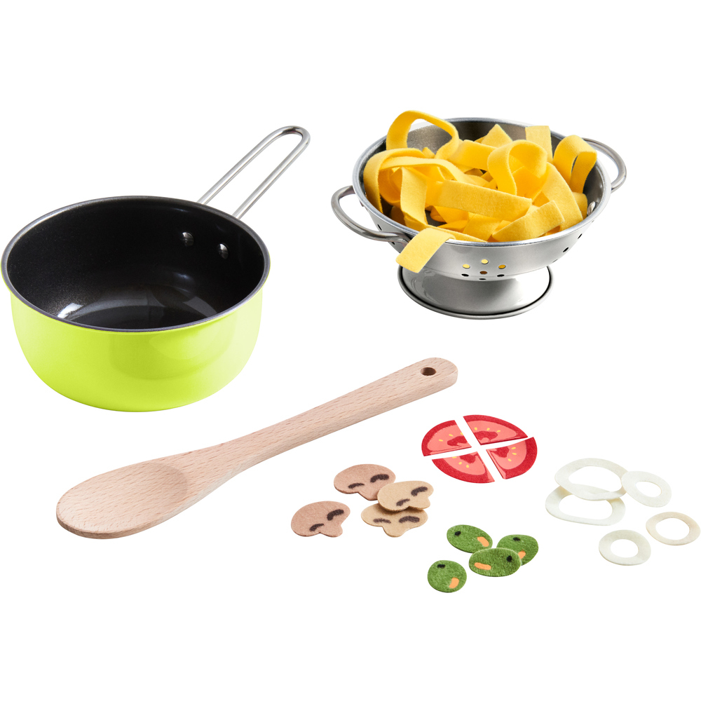 L'Ensemble cuisine italienne Haba est un set de dînette complet pour les enfants dès 3 ans, comprenant casserole, passoire, cuillère en bois et ingrédients en tissu pour préparer de délicieuses pâtes italiennes.