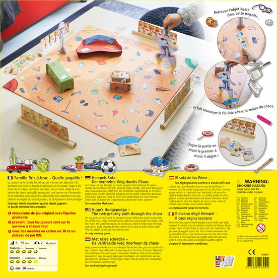 La maison de la famille Bric-à-brac est vraiment en désordre ! Et pendant que toute sa famille se prélasse sur le canapé, Hugo le fils tente de se frayer un chemin au milieu de ce chaos. Aidez-le à atteindre les objets éparpillés en gardant une bonne vue d’ensemble, en sollicitant votre mémoire et surtout en évitant de piétiner les objets des autres joueurs. Le gagnant est le premier à réunir quatre objets.