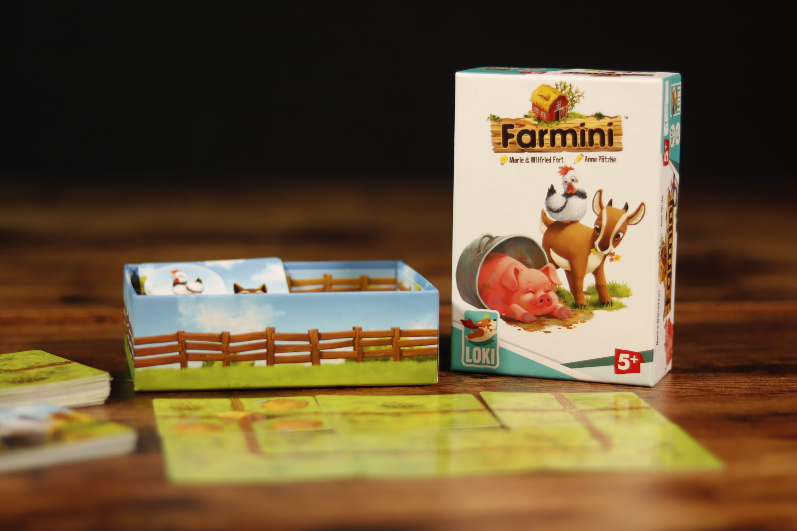 Farmini est un jeu de société familial où les joueurs construisent la plus belle ferme en protégeant leurs animaux et champs de maïs, tout en évitant le loup.