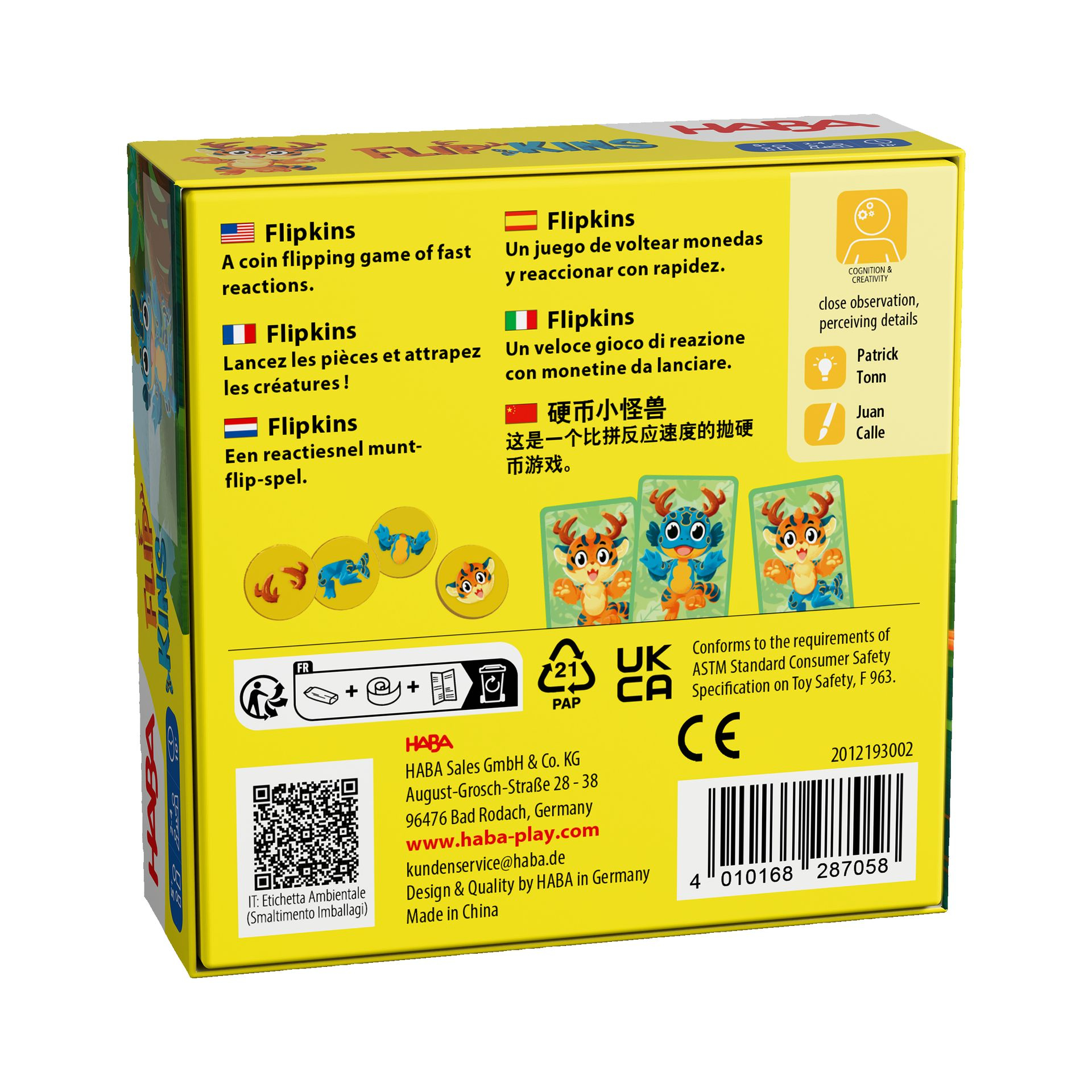Flipkins de HABA est un jeu d'observation et de rapidité pour 2 à 4 joueurs dès 5 ans. Lancez les pièces, identifiez les caractéristiques et attrapez les cartes correspondantes. Un jeu dynamique et éducatif pour toute la famille.