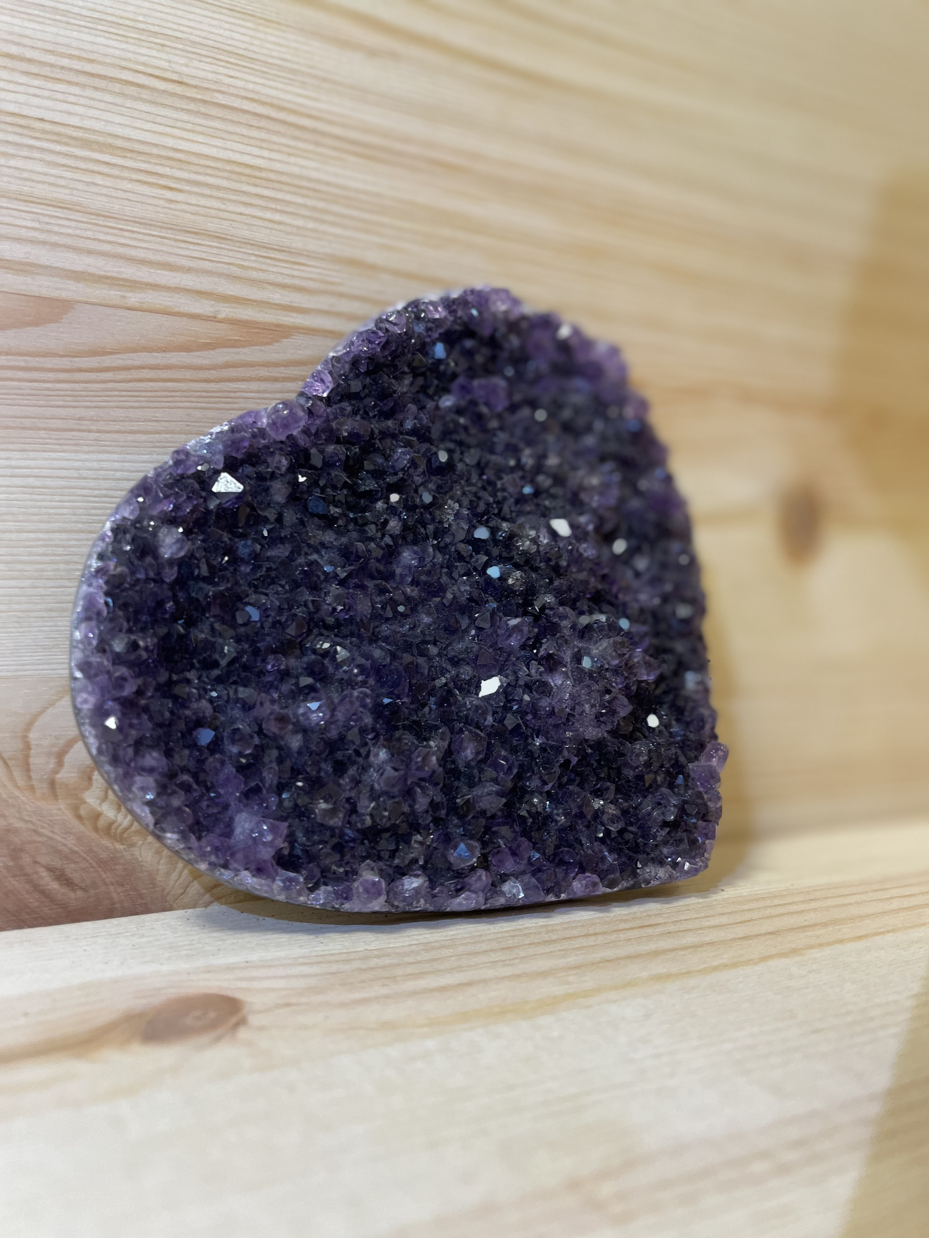 Apparence : Géode en frome de coeur Couleur(s) : Violet / Blanc / Transparent Qualité : AA+ = Excellente