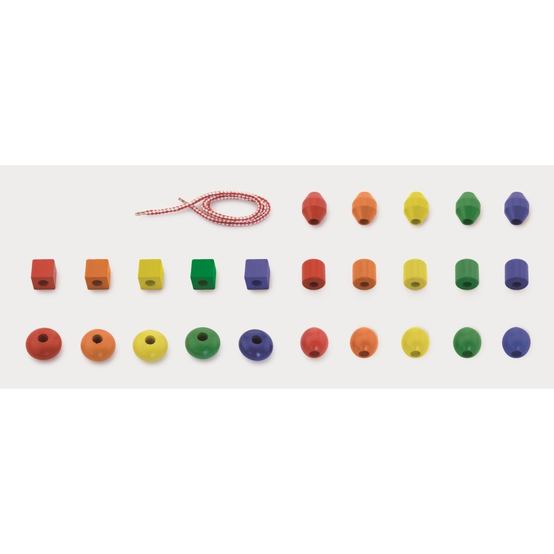Coffret de 130 grosses perles en bois FSC et 10 lacets, idéal pour développer la motricité fine et la créativité des enfants dès 3 ans.