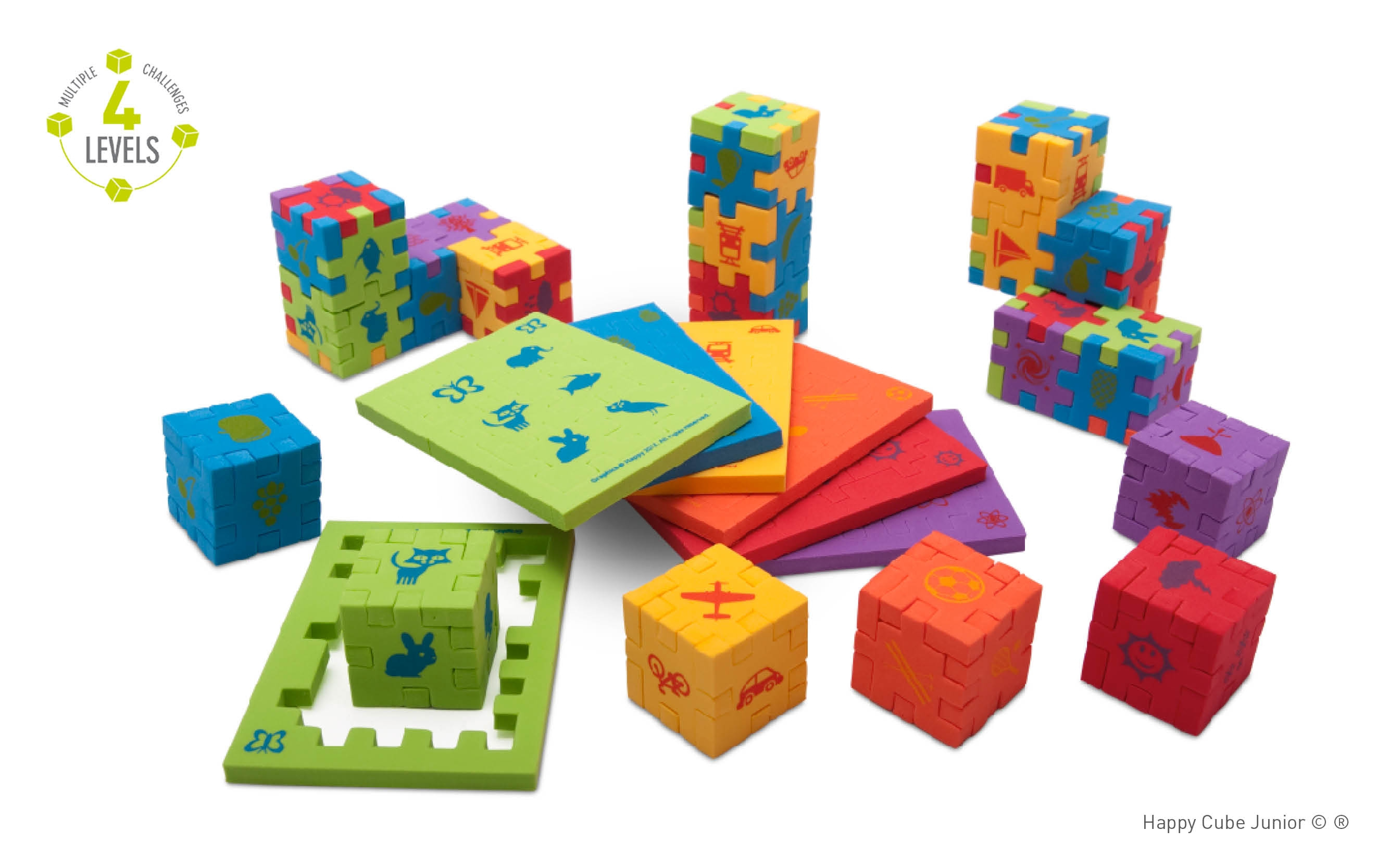 Le Happy Cube Junior comprend 6 puzzles de cube de mousse différents. Avec chaque casse-tête, la difficulté devient plus difficile. Le défi ultime est de combiner les énigmes dans les grandes constructions.