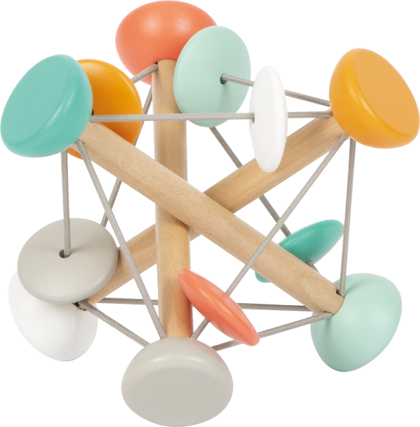 Trois baguettes de bois associées par des élastiques peuvent être tournées et tirées dans tous les sens. Voici un défi sportif pour les petites mains. Les éléments colorés coulissants claquètent lorsqu´on les secoue, au grand bonheur des tout-petits.