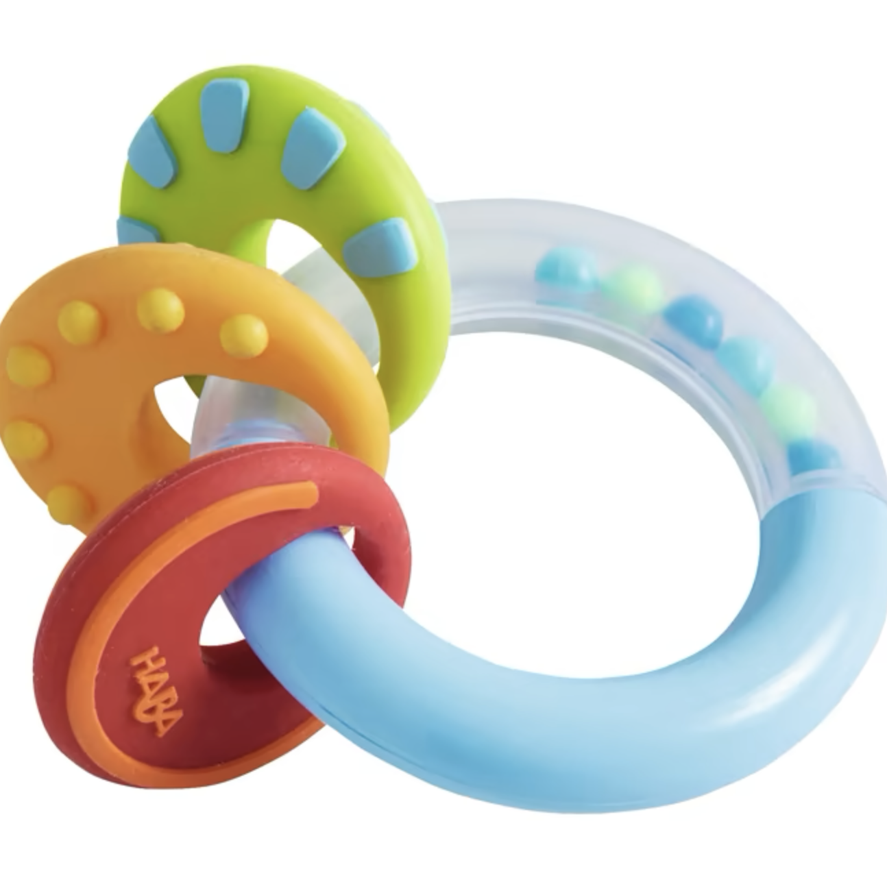 Le Hochet Noppi de HABA est un jouet d'éveil en silicone pour bébés dès 6 mois, offrant stimulation sensorielle et soulagement lors de la poussée dentaire.