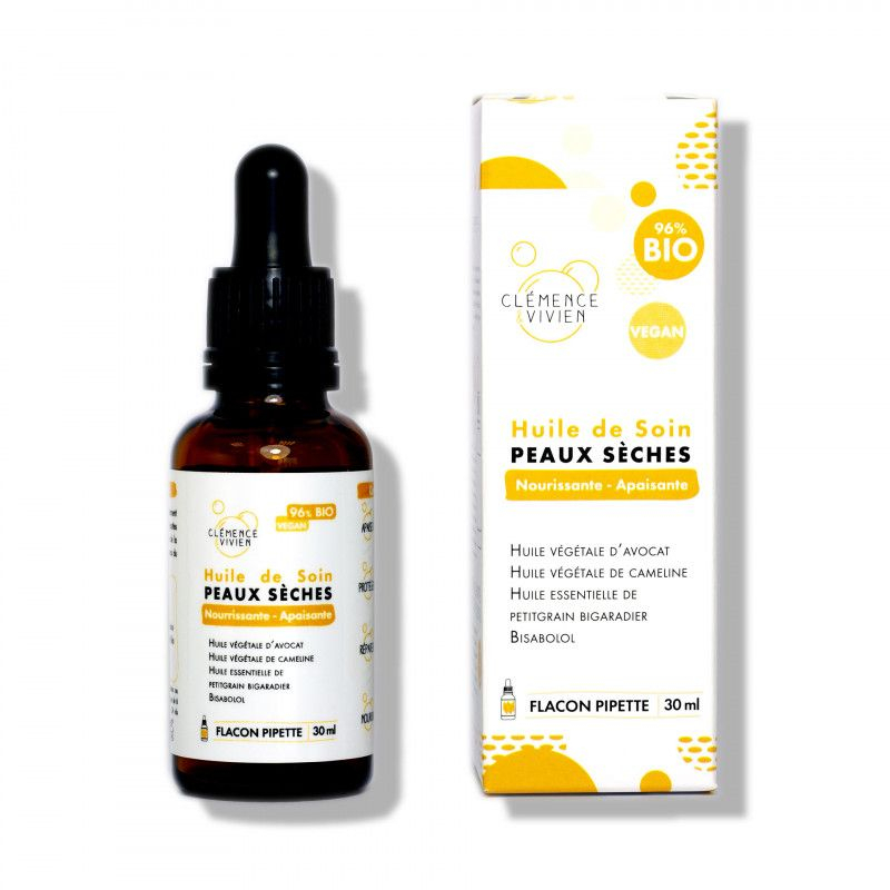 L'Huile de Soin Peaux Sèches de Clémence & Vivien est un soin 100% naturel, conçu pour nourrir, apaiser et protéger les peaux sèches grâce à une synergie d'huiles végétales biologiques et d'actifs naturels.