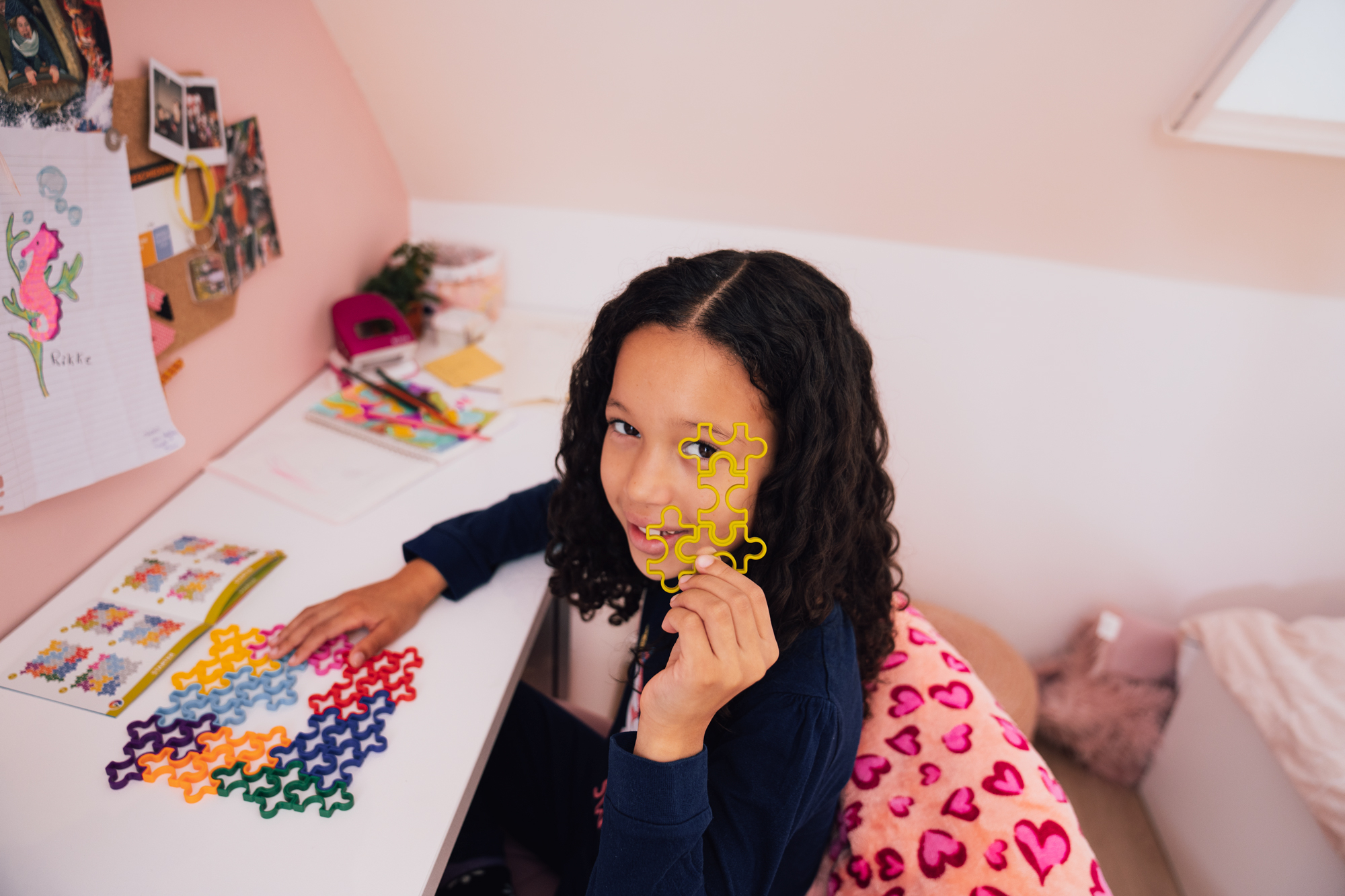 Choisissez un défi, suivez les indices, et assemblez dans un cadre de 6x6 pièces les neuf pièces de couleur.