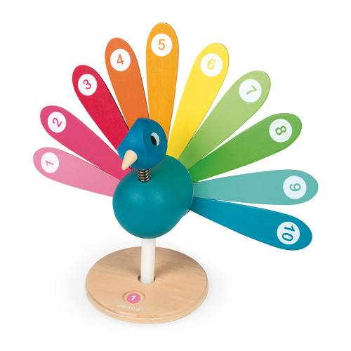 Initiez votre enfant aux chiffres de 1 à 10 avec le J'apprends à compter Paon de Janod, un jouet en bois coloré et interactif conçu pour les enfants dès 2 ans.