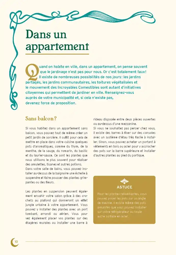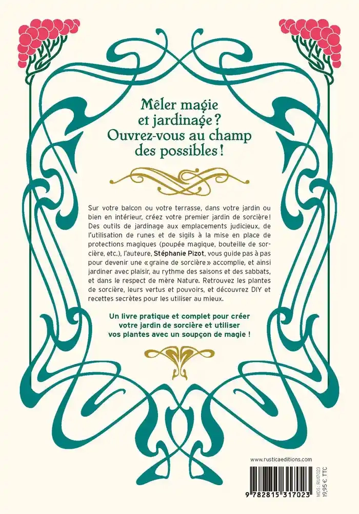 Mêler magie et jardinage ? Ouvrez-vous au champ des possibles ! Sur votre balcon ou votre terrasse, dans votre jardin ou bien en intérieur, créez votre premier jardin de sorcière ! Des outils de jardinage aux emplacements judicieux, de l'utilisation de runes et de sigils à la mise en place de protections magiques (poupée magique, bouteille de sorcière, etc.), l'auteure, Stéphanie Pizot, vous guide pas à pas pour devenir une " graine de sorcière " accomplie, et ainsi jardiner avec plaisir, au rythme des saisons et des sabbats, et dans le respect de mère Nature.
