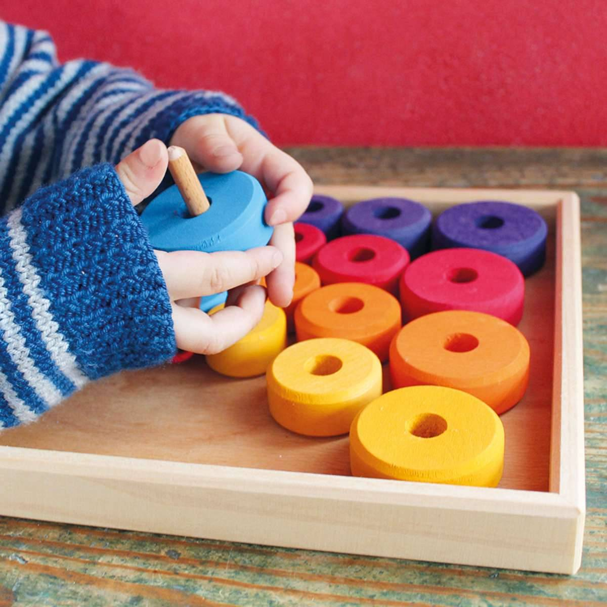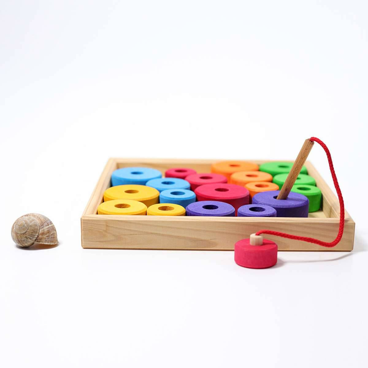 Stimulez la motricité fine de votre enfant avec le Jeu d'enfilage en bois de Grimm's, composé de perles colorées, d'une aiguille en bois et d'un cordon, le tout fabriqué en bois de hêtre certifié FSC avec des finitions non toxiques.