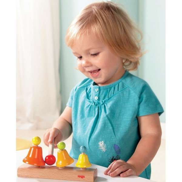 Le Jeu de clochettes de Haba est un instrument musical en bois et métal, idéal pour les enfants dès 2 ans. Il favorise l'éveil musical et la motricité fine grâce à ses trois clochettes colorées et sa baguette. Fabriqué en Allemagne avec des matériaux écologiques et sûrs.