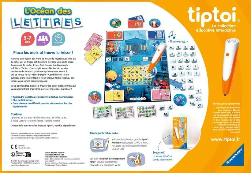 Au fond de l’océan des mots se trouve la mystérieuse ville de Sonotis. Là, un trésor est dissimulé derrière une porte close. Pour ouvrir la porte, il vous faut trouver les deux mots solutions. Tentez d’accomplir ensemble les tâches des habitants de la mer. Retrouve une musique et des dizaines d'informations. 'L'océan des lettres' est un jeu interactif accessible dès 5 ans. Fonctionne uniquement avec le lecteur tiptoi®, vendu séparément.