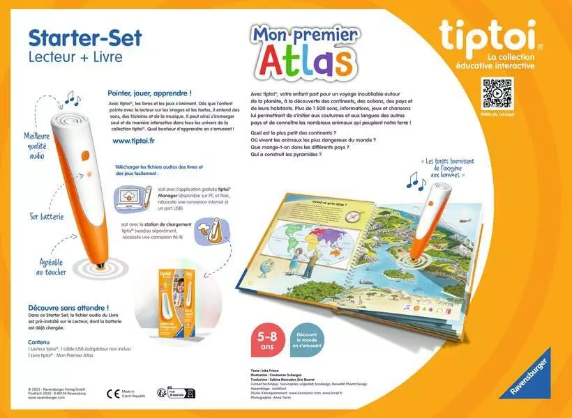 tiptoi® est un lecteur éducatif interactif qui permet aux enfants de découvrir le monde de façon ludique et autonome. Lorsque l’enfant pointe le lecteur sur une image ou un texte du support, il entend des sons, des informations, des personnages ou de la musique. Apprendre n’a jamais été aussi vivant et ludique ! tiptoi® apporte une dimension nouvelle au contenu pédagogique des supports : que ce soit dans les livres, les jeux ou le globe, l’enfant n’a qu’à pointer le lecteur dessus et tout s’anime comme par magie ! Ce produit est composé de matériaux issus de forêts bien gérées certifiées FSC®, de matériaux recyclés et de matériaux issus d’autres sources contrôlées (FSC-C111262).