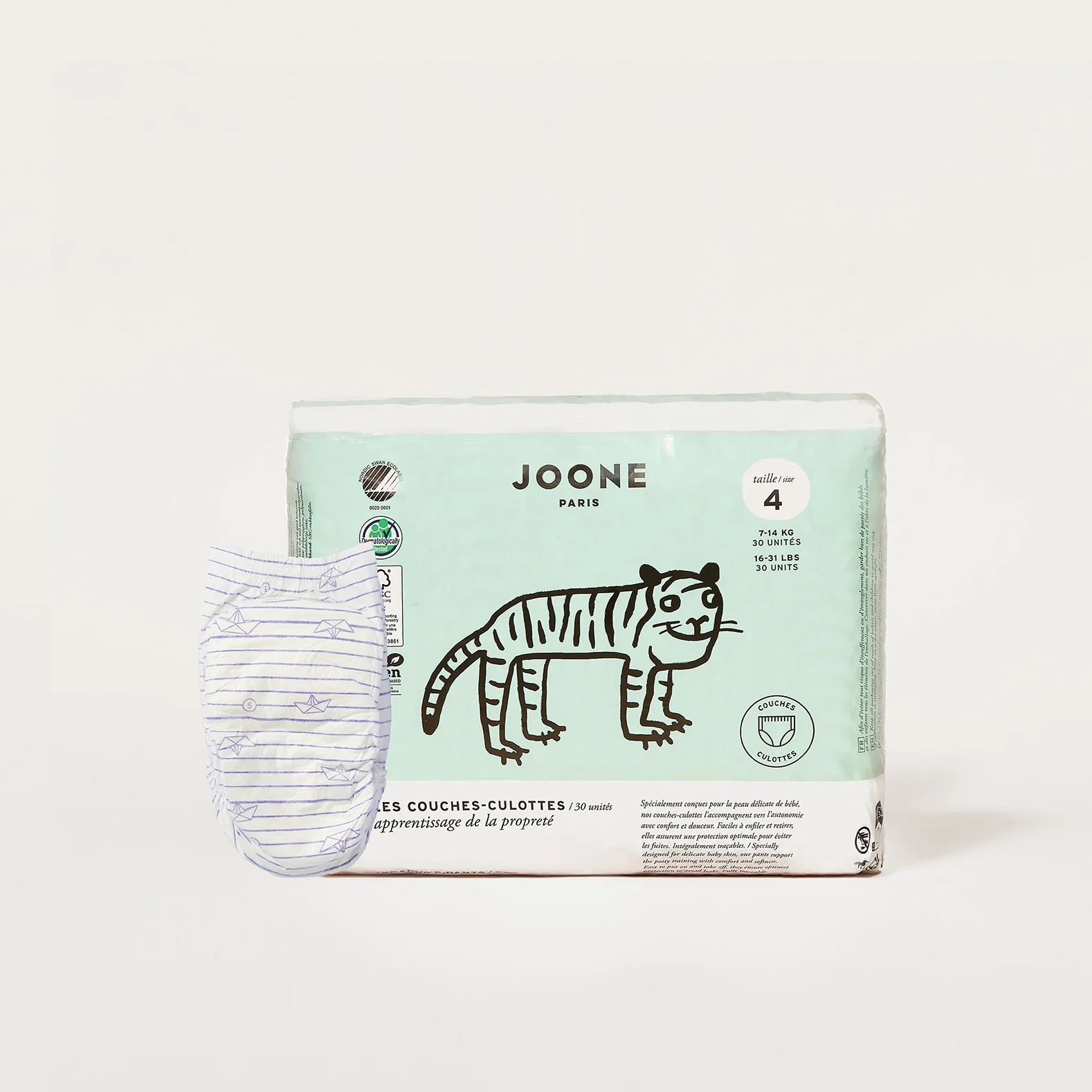 Les couches-culottes JOONE T5 (12-18 kg) offrent confort et sécurité à votre enfant, tout en respectant l'environnement grâce à leur fabrication écologique et leurs certifications FSC et Nordic Swan.