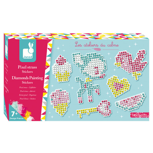 Le Kit créatif Pixel Strass Stickers de Janod permet aux enfants de 7 à 12 ans de créer des décorations scintillantes en collant des mini-strass sur des stickers autocollants transparents. Le kit comprend 7 autocollants, 750 mini-strass, un plateau, un stylet à strass, un carré de cire et un livret d'instructions. Dimensions de la boîte : 22 x 4 x 13 cm. Une activité idéale pour développer la motricité fine et la créativité.