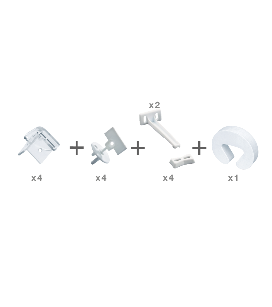 L'essentiel de sécurité maison garde les enfants en sécurité. Ce kit contient 13 accessoires indispensables pour une sécurité optimale dans la maison: 4 protège-coins, 4 cache-prises avec 2 clés de démontage, 4 bloque-tiroirs et 1 amortisseur de porte.