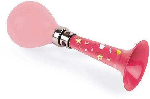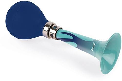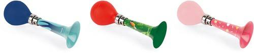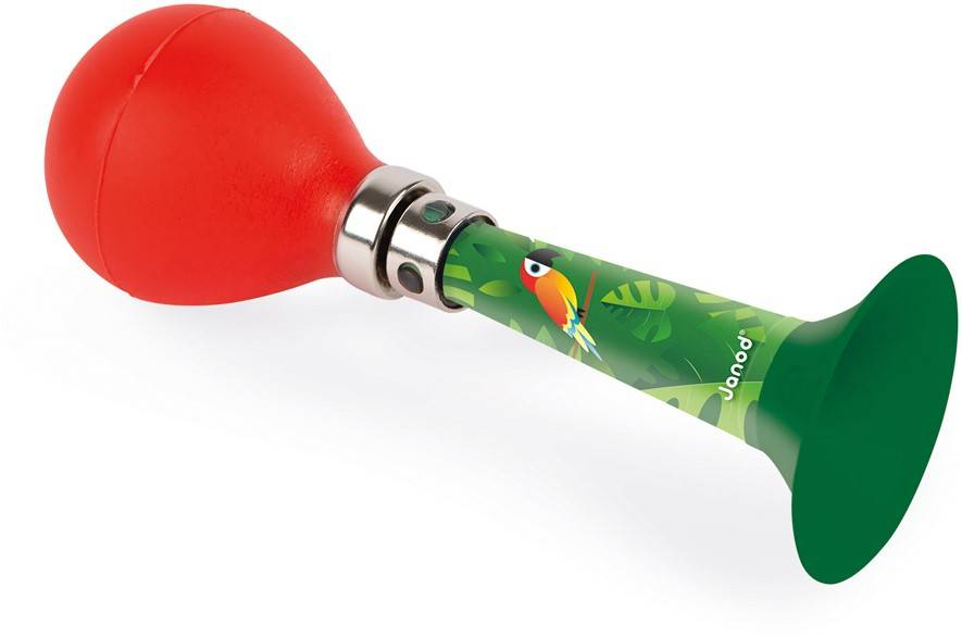 Klaxon vélo Janod en métal et plastique, disponible en trois coloris, s'adapte à tous les guidons pour des balades amusantes et sécurisées dès 3 ans.