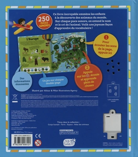 L'atlas des animaux - Mon livre sonore de 1,2,3 Soleil est un livre interactif avec 250 puces sonores, des illustrations captivantes et des jeux d'observation, parfait pour les enfants de 3 à 6 ans.