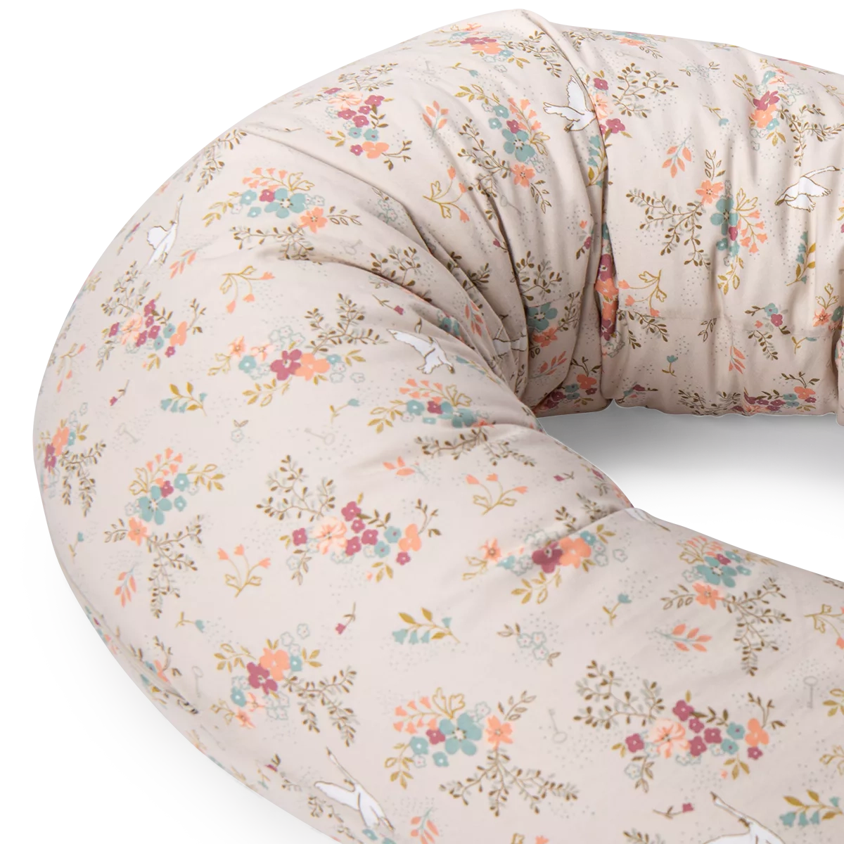 Coussin de maternité 2 en 1 de la collection "La petite école de danse" par Moulin Roty, offrant soutien pendant la grossesse et confort lors de l'allaitement. Garnissage en microbilles silencieuses, housse en coton certifié OEKO-TEX®, amovible et lavable. Dimensions : 170 cm.