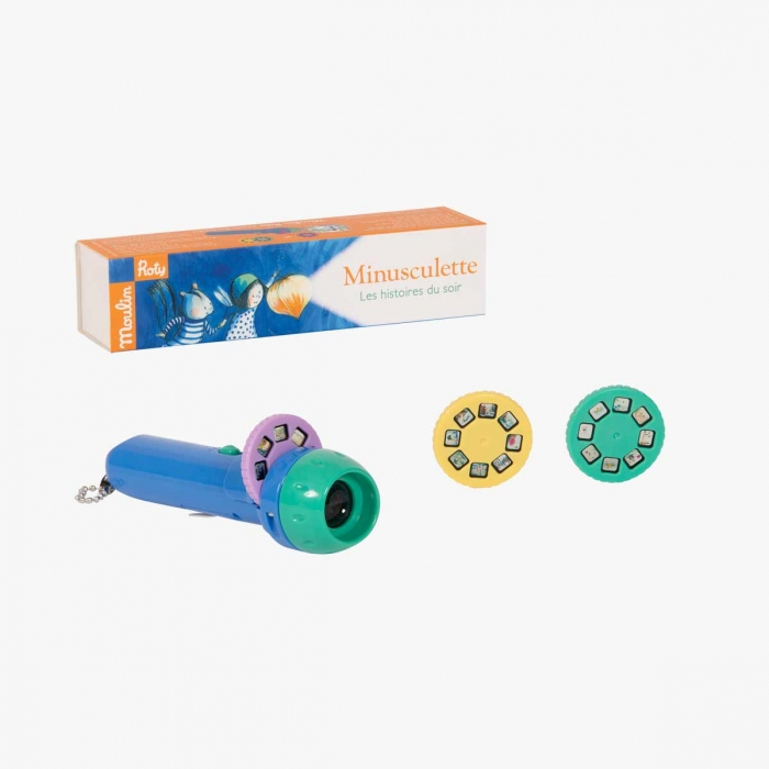 Découvrez la Lampe à histoires Minusculette de Moulin Roty, une lampe torche projetant des images colorées pour raconter les aventures féeriques de Minusculette. Idéale pour développer l'imagination des enfants dès 3 ans.