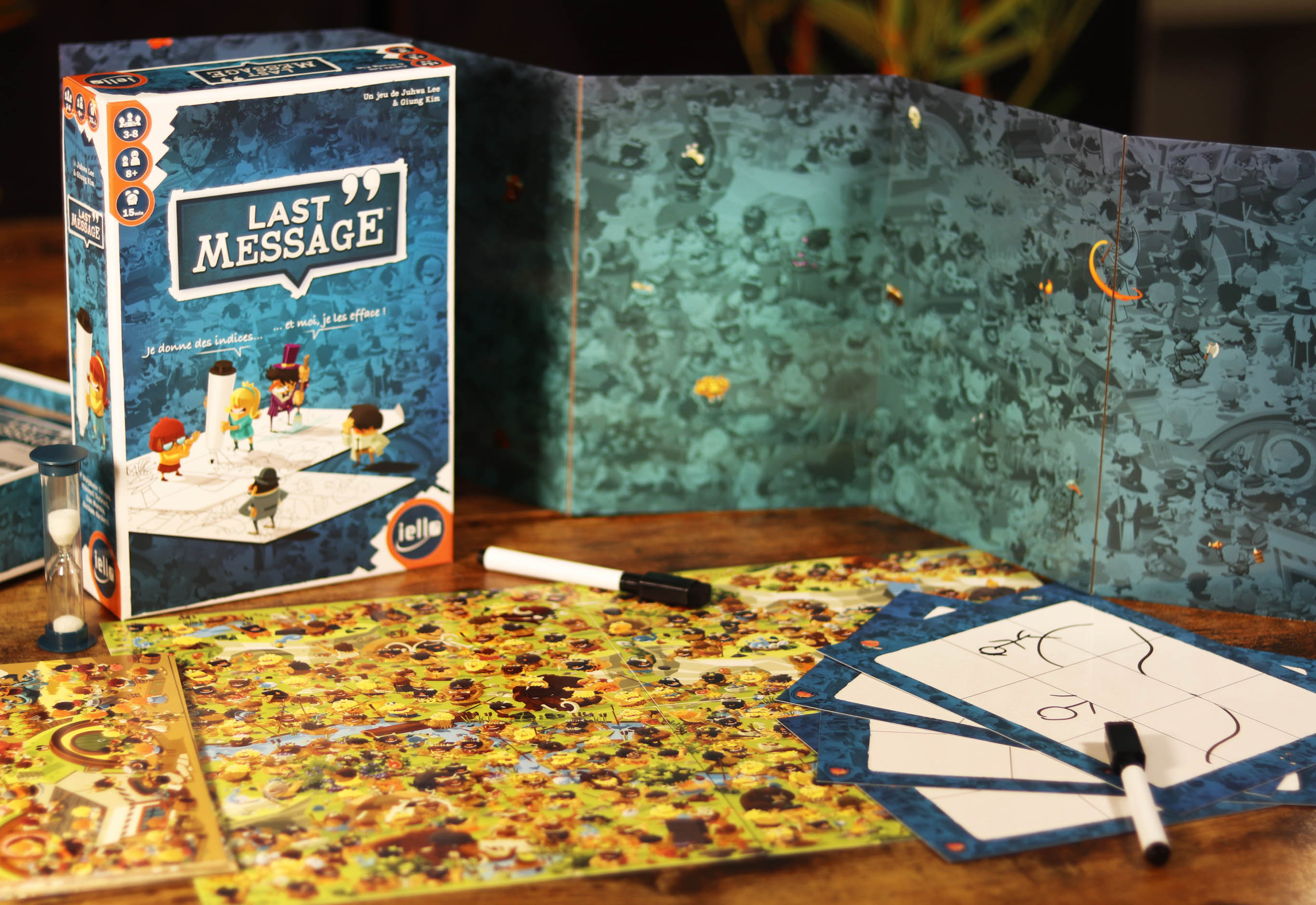 Dans Last Message, de 3 à 8 joueurs se divisent en trois rôles. Une victime. Un coupable. Des enquêteurs. Le crime a eu lieu dans la foule : identifier le coupable sera donc particulièrement complexe. Mais heureusement, la victime peut encore transmettre des indices aux enquêteurs quant à l’identité du coupable. Feutre effaçable en main, elle peut écrire ou dessiner des informations permettant de l’identifier sur une ardoise découpée en 9 cases. Attention : la victime ne dispose que de 30 secondes pour composer son message. L’ardoise est ensuite transmise… au coupable.