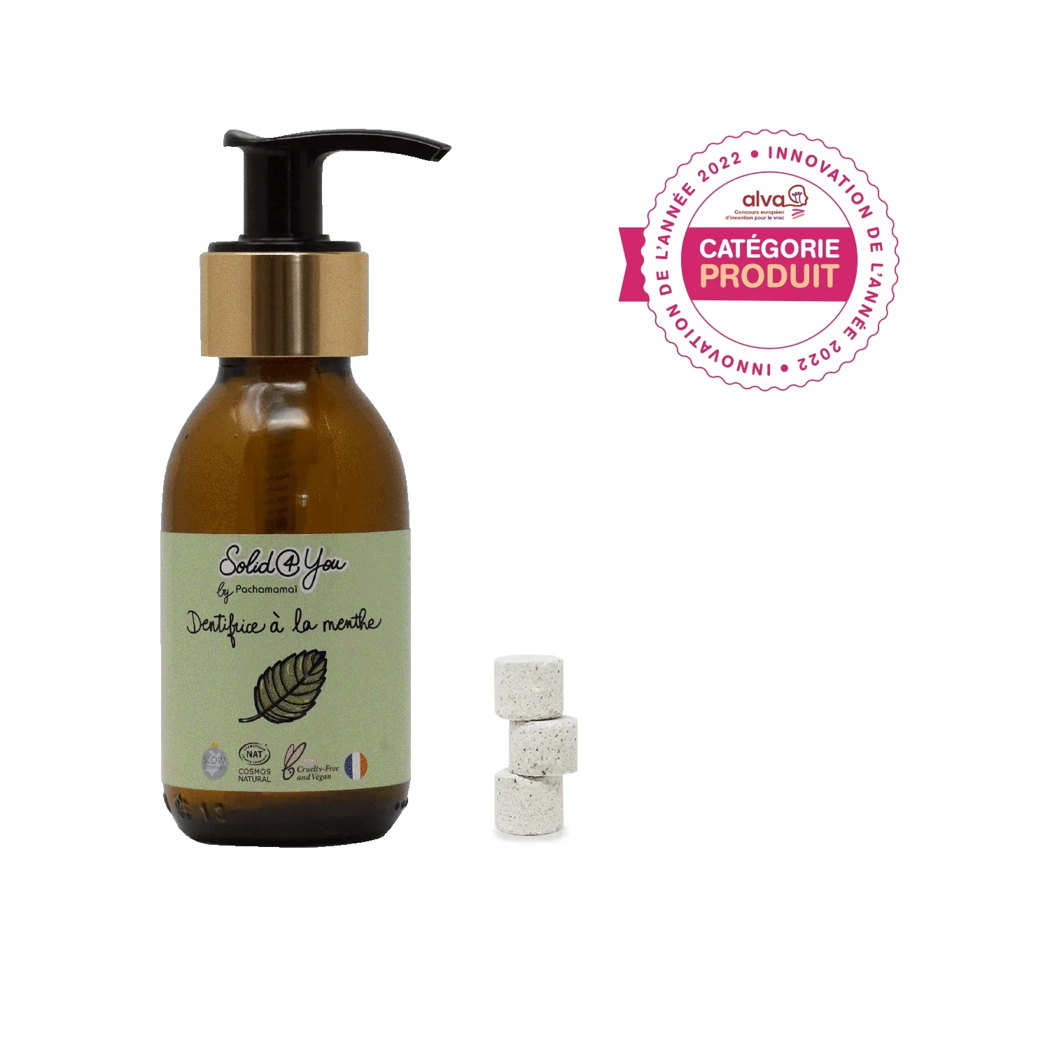 Le dentifrice à dissoudre bio est un dentifrice liquide obtenu à partir de pastilles solides. Aussi doux que frais. Imaginé en vallée de Chevreuse, c’est un concentré d’actifs d’origine naturelle : notamment l’amidon de tapioca bio, l’erythritol, le carbonate de calcium, le bicarbonate de soude et l’huile essentielle de menthe poivrée bio compris dans sa formule. Ils sont reconnus pour de nombreux bienfaits :