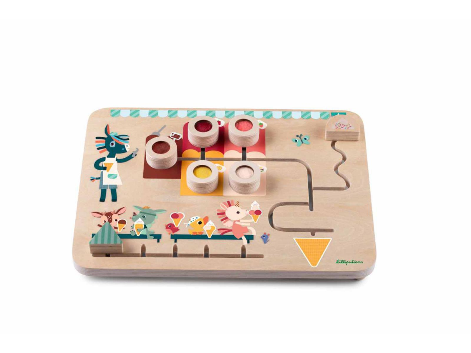 Le panneau d'éveil coulissant 'Le Glacier' de Lilliputiens est un jeu en bois conçu pour les enfants dès 18 mois, favorisant la motricité fine et l'imagination.