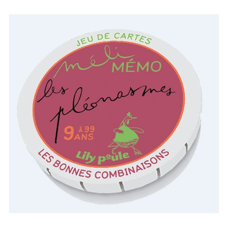 Les Pléonasmes de Lily Poule est un jeu éducatif pour enfants dès 9 ans, visant à identifier et comprendre les pléonasmes courants de la langue française. Contenu : 32 cartes rondes plastifiées, une carte de règles, le tout dans une boîte en métal compacte. Fabriqué en France.