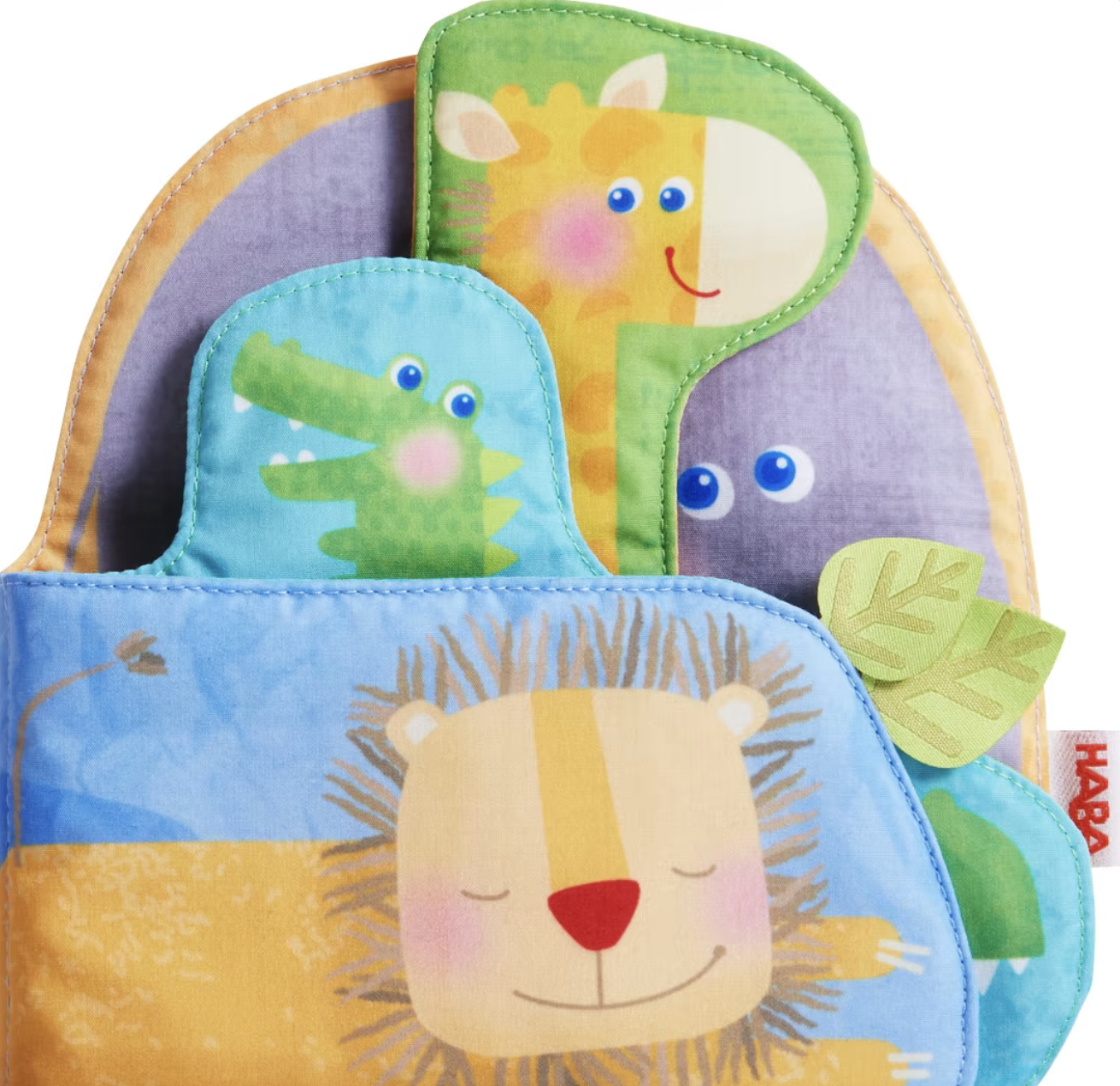 Le Livre en tissu Animaux sauvages de HABA est un jouet d'éveil doux et coloré pour les bébés dès 6 mois, avec des illustrations d'animaux et des éléments sonores.