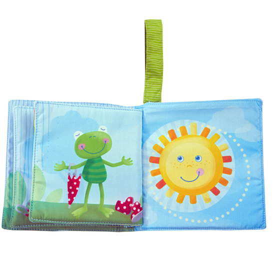 Le Livre en tissu Monde arc-en-ciel de Haba est un jouet d'éveil sensoriel pour bébés dès 6 mois, offrant textures variées et sons captivants pour stimuler les sens et la motricité fine.