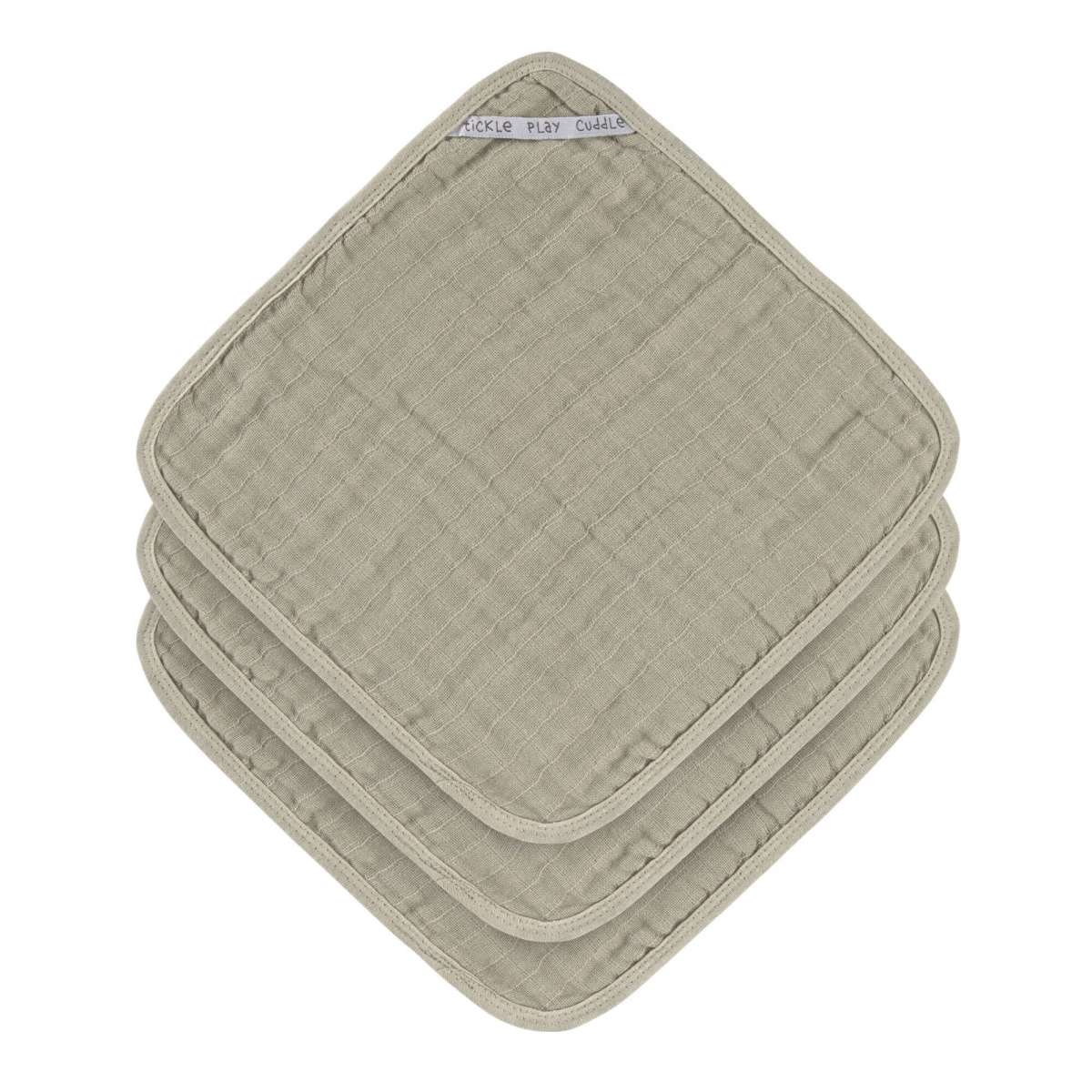 Lot de 3 débarbouillettes en gaze de coton Olive de Lässig, douces et respectueuses de la peau de bébé, certifiées GOTS, dimensions 16 x 16 cm, lavables à 40°C.