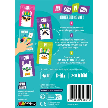 Machu Pichu est un jeu d'ambiance rapide et délirant où vous devez vous débarrasser de vos cartes en repérant les lamas avec des accessoires communs. Attention aux séquences "MA-CHU-PI" qui déclenchent des actions spéciales ! Un jeu parfait pour des parties pleines d’énergie en famille ou entre amis.