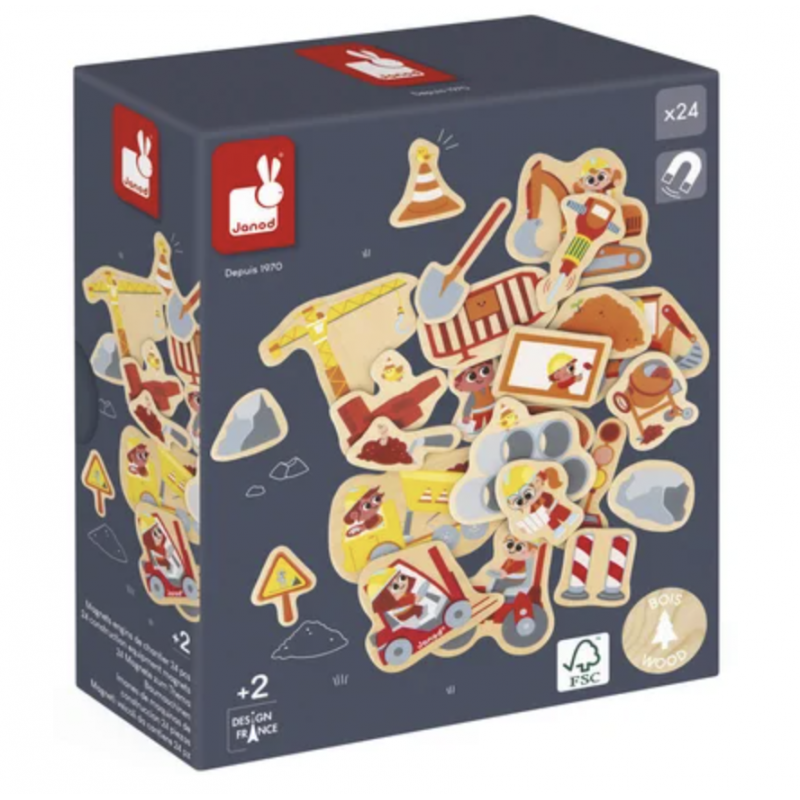 - Contenu : 24 magnets en bois représentant divers engins de chantier tels que des grues, des pelleteuses, des camions, ainsi que des éléments de signalisation et des ouvriers.
