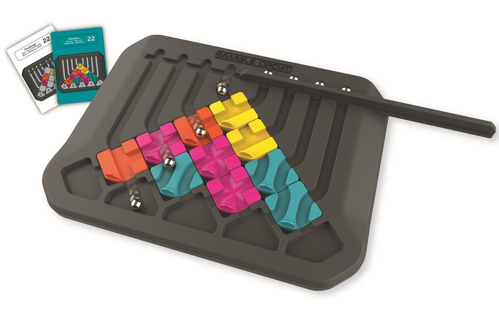 Prévoyez la trajectoire des billes et ajoutez les autres tuiles mystère de façon à ce que le nombre de billes qui s'accumulent dans les cinq cibles corresponde à la carte de défi.