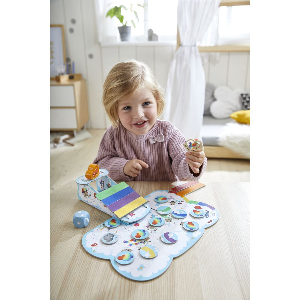 Aidez le chat Kaya à rejoindre les moutons en construisant un toboggan arc-en-ciel dans Mes Premiers Jeux – Saute-Nuages, un jeu coopératif pour enfants dès 2 ans. Ce jeu éducatif enseigne les chiffres de 1 à 3 et les six couleurs de l'arc-en-ciel.