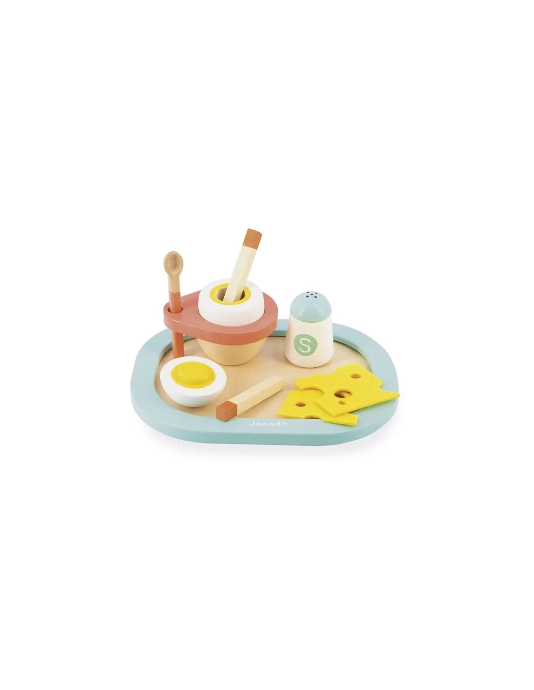 Découvrez 'Mon Premier Coquetier' de Janod, un set de dinette en bois FSC® pour enfants dès 3 ans, idéal pour développer imagination et motricité fine.
