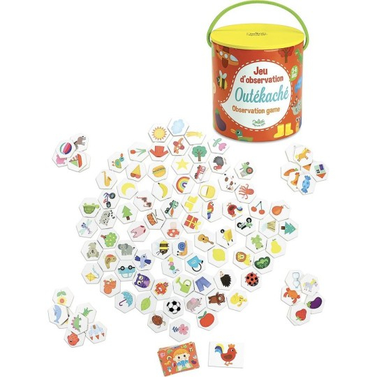 Outékaché de Vilac est un jeu d'observation et de rapidité pour enfants dès 3 ans. Retrouvez le dessin de la carte piochée parmi 100 pièces en bois, mais attention aux pièges !