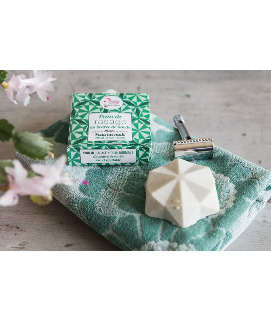 Enrichi au beurre de karité bio et commerce équitable, il agit en soin au moment du rasage. Rincez lorsque vous avez terminé ! Ce pain de rasage solide est mixte et peut s'utiliser sur le visage, les jambes, les aisselles...!