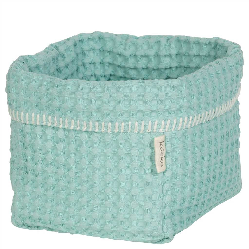 Le panier de rangement est confectionné en tissu gaufré, ce qui lui donne un look original. Il est renforcé à l'aide de fibres synthétiques et l'extérieur est confectionné en flanelle. Le panier est décoré d'un point de feston brodé et d'un petit onglet affichant le logo Koeka.