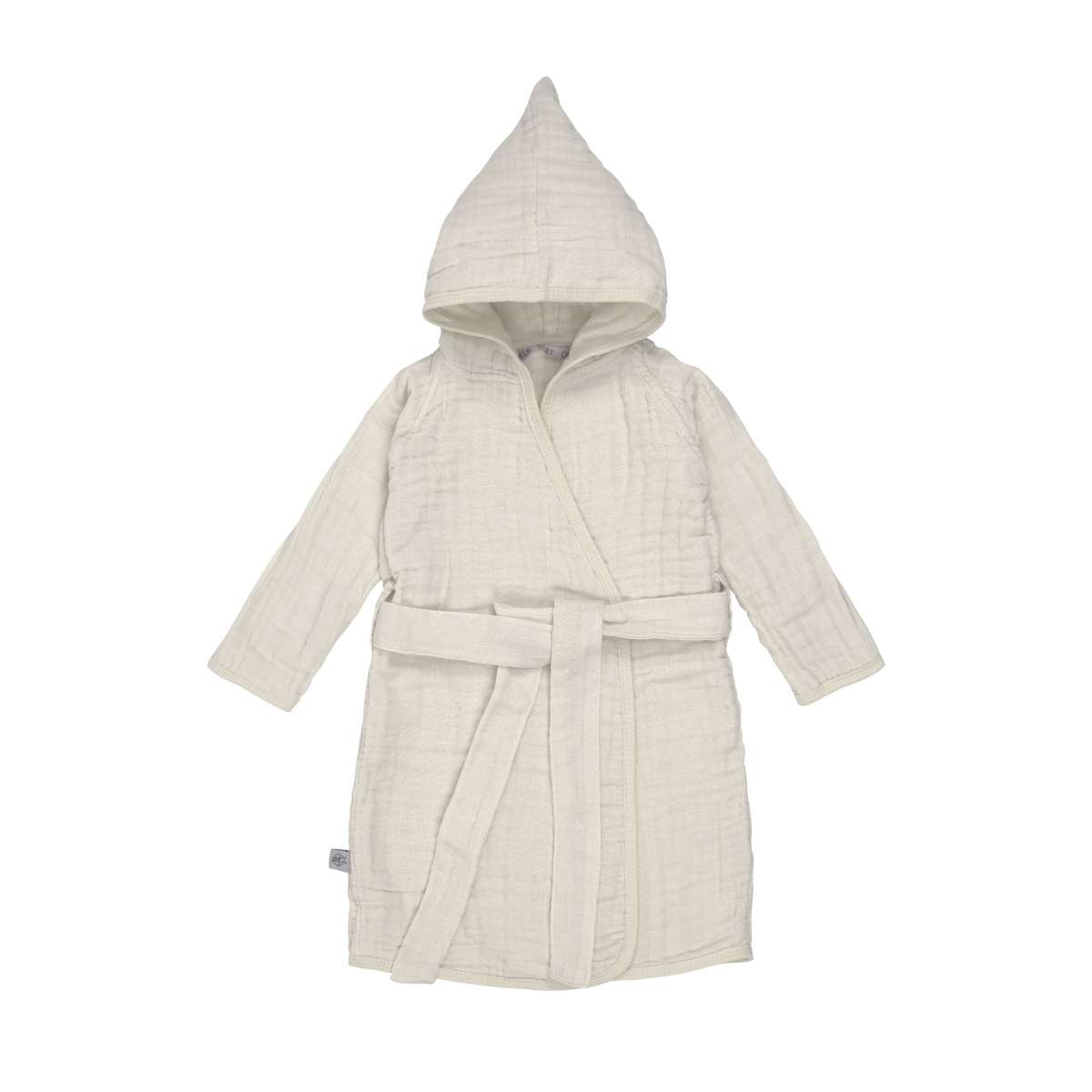 Peignoir en gaze de coton Milky de Lässig, 100% coton respirant, avec capuche et ceinture intégrées. Disponible en tailles 80/86 et 92/98. Lavable en machine à 40°C.