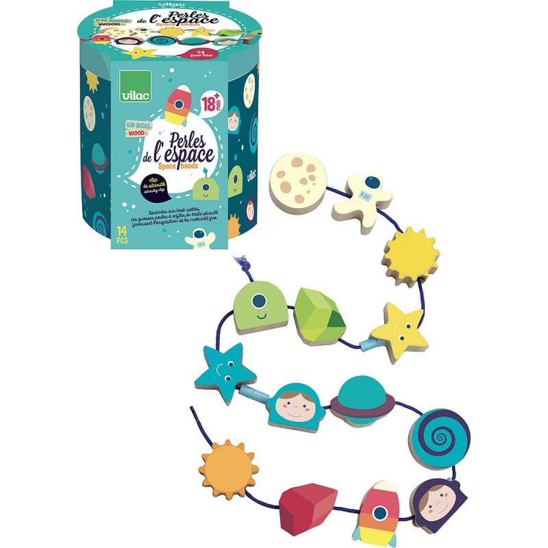 Les Perles de l'espace - Dans les Étoiles de Vilac sont un jeu de perles en bois sur le thème de l'espace, conçu pour les enfants dès 18 mois. Il stimule la motricité fine et l'imagination.