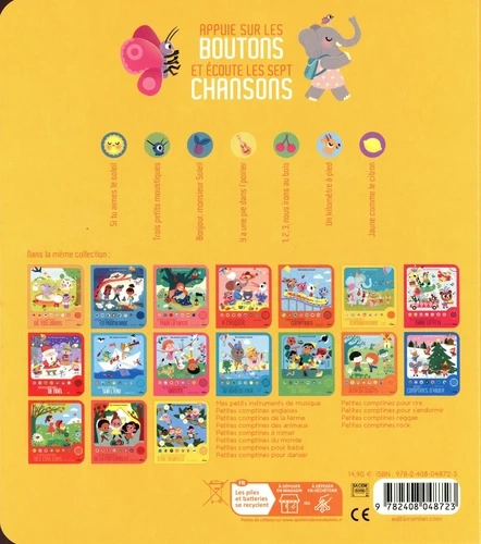 Chaque comptine est accompagnée d'un boîtier musical intégré avec 7 boutons, permettant à l'enfant de déclencher une écoute de 20 secondes en toute autonomie. Cette approche favorise le développement du langage et l'éveil musical grâce aux rimes, répétitions et rythmes simples qui captivent l'attention des tout-petits.