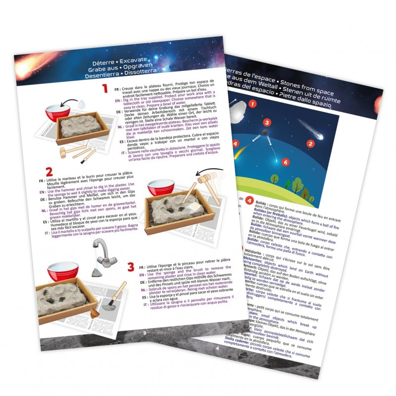 Explorez l'espace avec le kit 'Pierres de l'espace' de Buki : déterrez 5 pierres extraterrestres, dont une véritable météorite pierreuse et des tectites. Inclus : outils, plateau et notice illustrée. Dès 8 ans.