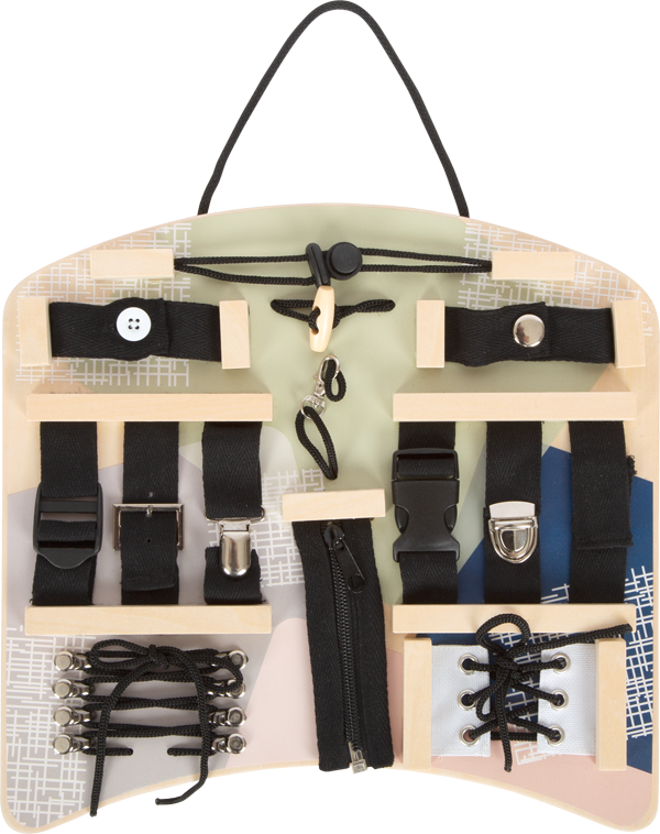 Cette planche d'apprentissage en bois, équipé de fermetures de différents types, offre 14 possibilités de jeu et de motricité. La planche de jeu aux couleurs modernes et tendance, avec une grande part de bois visible, offre aux jeunes enfants une multitude de possibilités de jeu et d'activités pour développer leurs motricité fines. Du bouton de garrot avec boucle à la fermeture éclair et au clic en passant par la boucle de ceinture, le velcro et la pince à bretelles, cette planche d'activités offre une multitude de possibilités de fermeture que les enfants connaissent dans leur vie quotidienne et qu'ils peuvent exercer de manière ludique. Avec des lacets pour s'entraîner à l'enfilage et à faire des boucles. En ouvrant, en fermant et en enfilant, les enfants entraînent de manière ludique la préhension ainsi que la coordination œil-main. Un jouet issu de la pédagogie Montessori qui stimule la motricité de manière optimale. La forme ergonomique avec un renflement permet de jouer confortablement sur le ventre/les genoux. Poignée pratique pour le porter ou le suspendre incluse.