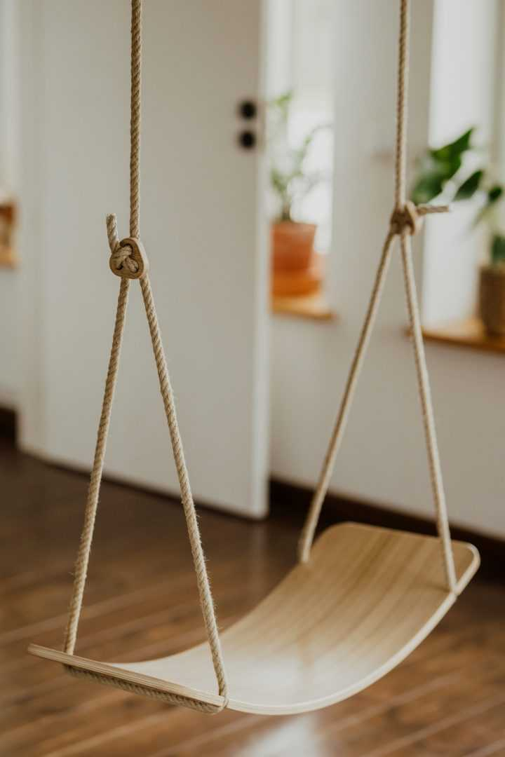 - Pour l’utiliser comme balançoire : Fixez la corde en chanvre à votre plafond et insérez-la dans les fentes spécialement prévues à cet effet, situées aux deux extrémités de la planche. Relevez la planche, ajustez la longueur de corde et profitez pleinement de la balançoire ! Vous pouvez être certain qu’elle sera l’endroit préféré de la maison, tant pour les enfants que pour les adultes !
