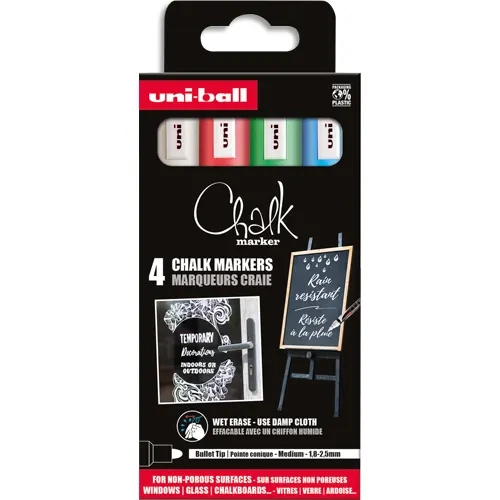Pochette 4 marqueurs craie CHALK. Pointe conique 1,8-2,5mm. Coloris Blanc,Vert Fluo,Rouge,Bleu UNI-BALL