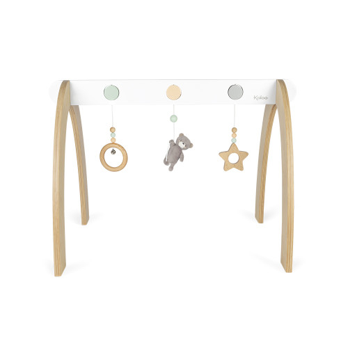 Ce joli portique en bois à poser au sol est le compagnon d'éveil idéal pour bébé lorsqu'il est allongé ou sur son transat. Il est composé de trois suspensions avec une activité différente pour favoriser le développement de bébé : activité sonore avec un anneau en bois et son grelot, activité visuelle avec un mini ours espiègle en peluche, idéal pour raconter des histoires ! Et une activité tactile avec une étoile en bois rehaussée de billes en bois et silicone. Avec ses couleurs douces et rassurantes, il sera très vite adopté par votre bébé.